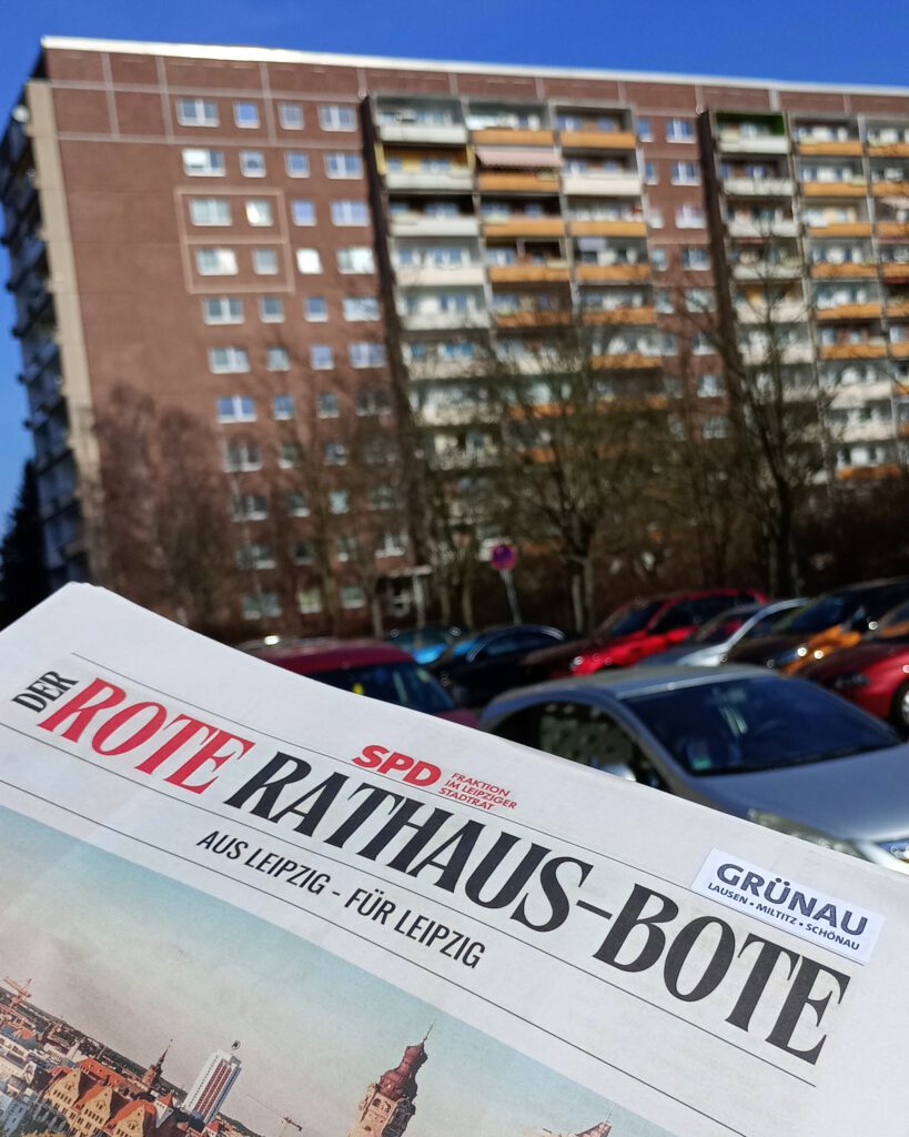 „Der Rote Rathaus Bote“ ist jetzt auch in Grünau in Umlauf. Die Ausgabe informiert über unsere Stadträtinnen und Stadträte, Stadtbezirksbeirätinnen und Stadtbezirksbeiräte. Schwerpunkte auf 12 Seiten: Bildung, Jugendhilfe, ÖPNV, Wohnen, Sport, Wirtschaft, Gleichstellung, Gewaltschutz, Stadtbezirksbudget, Brauchtumsmittel, Tierschutz. Mit Kontaktdaten zu allen AnsprechpartnerInnen in Fraktion und in den Stadtbezirken.